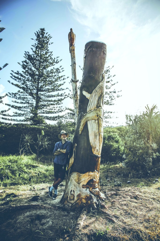 For the last 12 months Kay has been working on a special commission – a project named A TREE WITH A STORY TO TELL. In the 2019 bushfires, a giant Norfolk Pine died at Peregian Beach but it will continue to tell it’s story for the entire community thanks to an inspired idea for a sculpture. The pine has been reborn as an Environmental Message Post in a collaboration between local architect Sharyn Kerrigan, Peregian Beach Community Association member Rochelle Gooch and Kay. This project was funded by the Peregian Beach Community Association, Noosa Council and the Federal Government through its National Bushfire Recovery Fund. The tree at the Southern beach access of the Peregian Beach foreshore park (access 59) is thought to have suffered heat stress after the 2019 bushfire that threatened the village. The 4.5 metre stump that remained was carved into a story of the magnificent marine creatures along this part of the coast, the region and it’s nature wildlife and fauna. Although Kay’s masterpiece will gradually weather and erode it will continue to tell an important story as the new native trees around it grow to help protect the fragile dune system. How cool is that?